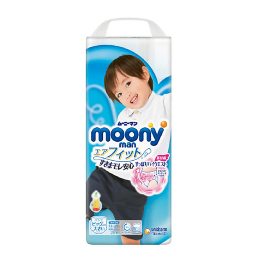 Moony japoniškos sauskelnės-kelnaitės pratintis ant puoduko, XL, 12-22 kg, berniukams, 30 vnt.